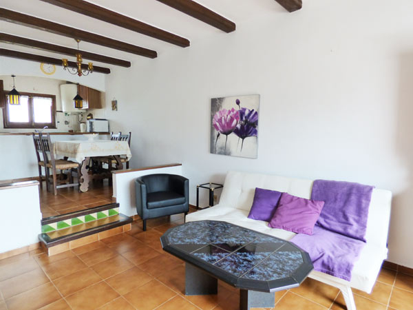 Parterre: offene Küche mit Spülmaschine, Essen, Wohnzimmer mit Bettcouch, Kamin und SAT-TV, Terrasse, kleiner Garten. Schöner Blick.
