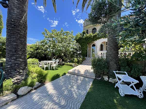 Well-kept garden with big palm and olive trees.